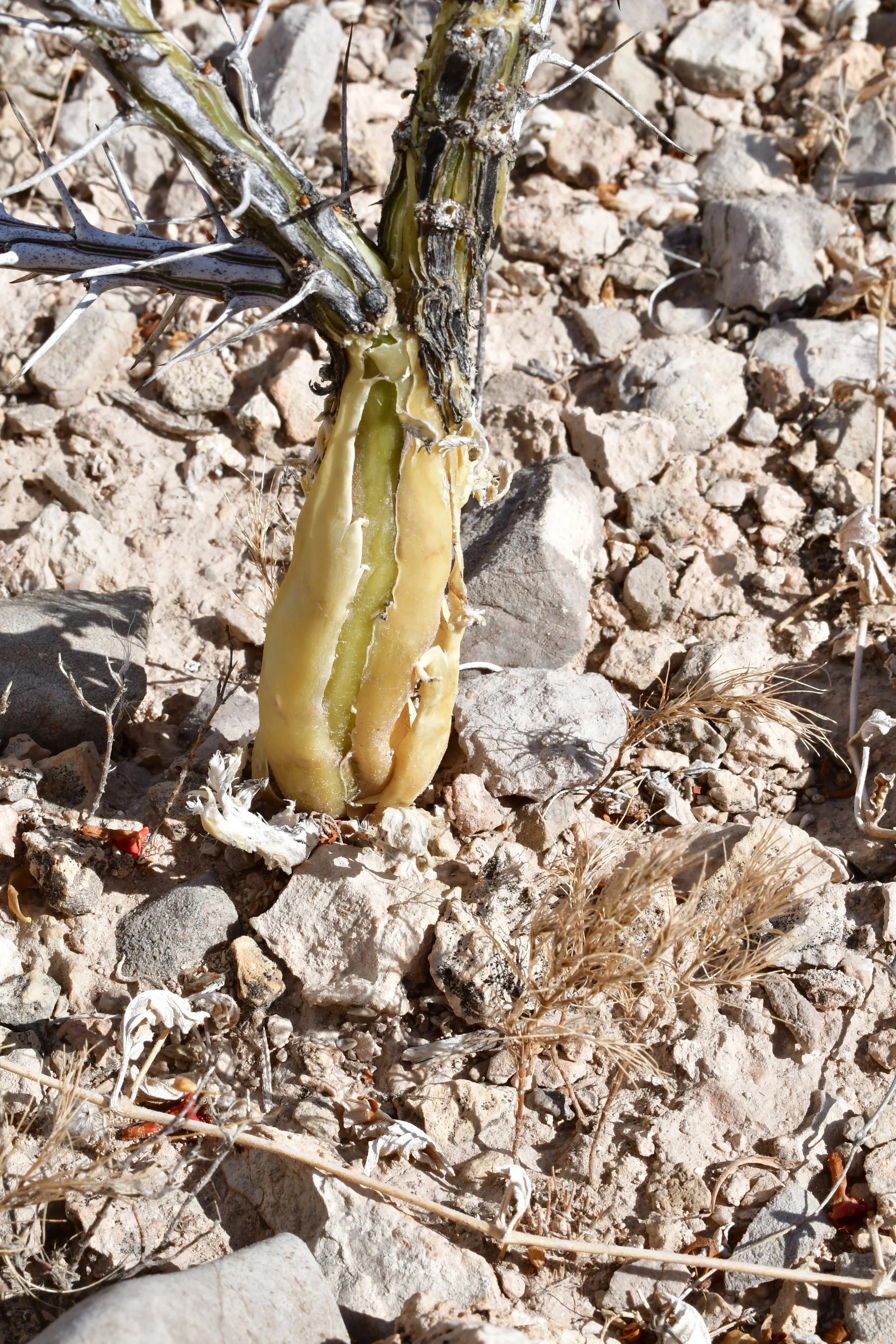 Any peyote that were growing in shadier conditions, say at the base of a rockwall, were much healthier-looking though, and we did see a few of these. We also saw the notorious Koeberlinia spinosa in flower. This plant also occurs in South Texas and Northern Mexico and is a spiny stem-photosynthesizer that is bizarre enough to be the only species in its family and is related to mustards (Order Brassicales).